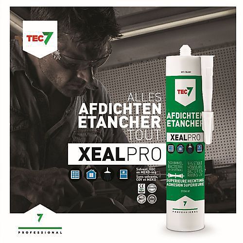 XealPro: TEC7 XealPro is dé nieuwe generatie all-in-one afdichtingskit voor professionals en veeleisende doe-het-zelvers. Bovendien is het de meest mens- en milieuvriendelijke afdichtingskit op de markt. XealPro is 100% MEKO-vrij en bevat geen schadelijke of verdachte bestanddelen.De voorbije decennia is het aantal kitten enorm toegenomen. Concurrerende merken brachten steeds meer specifieke kitten op de markt. Dat resulteert in een muur aan kokers waarin zelfs professionals hun weg kwijt geraken. Gebruikers moeten investeren in talloze kokers die half opgebruikt liggen uitharden.Dat is nu verleden tijd. Binnen, buiten, sanitair, keuken, glas, hout, …. XealPro is geschikt voor élke toepassing op elke plaats.