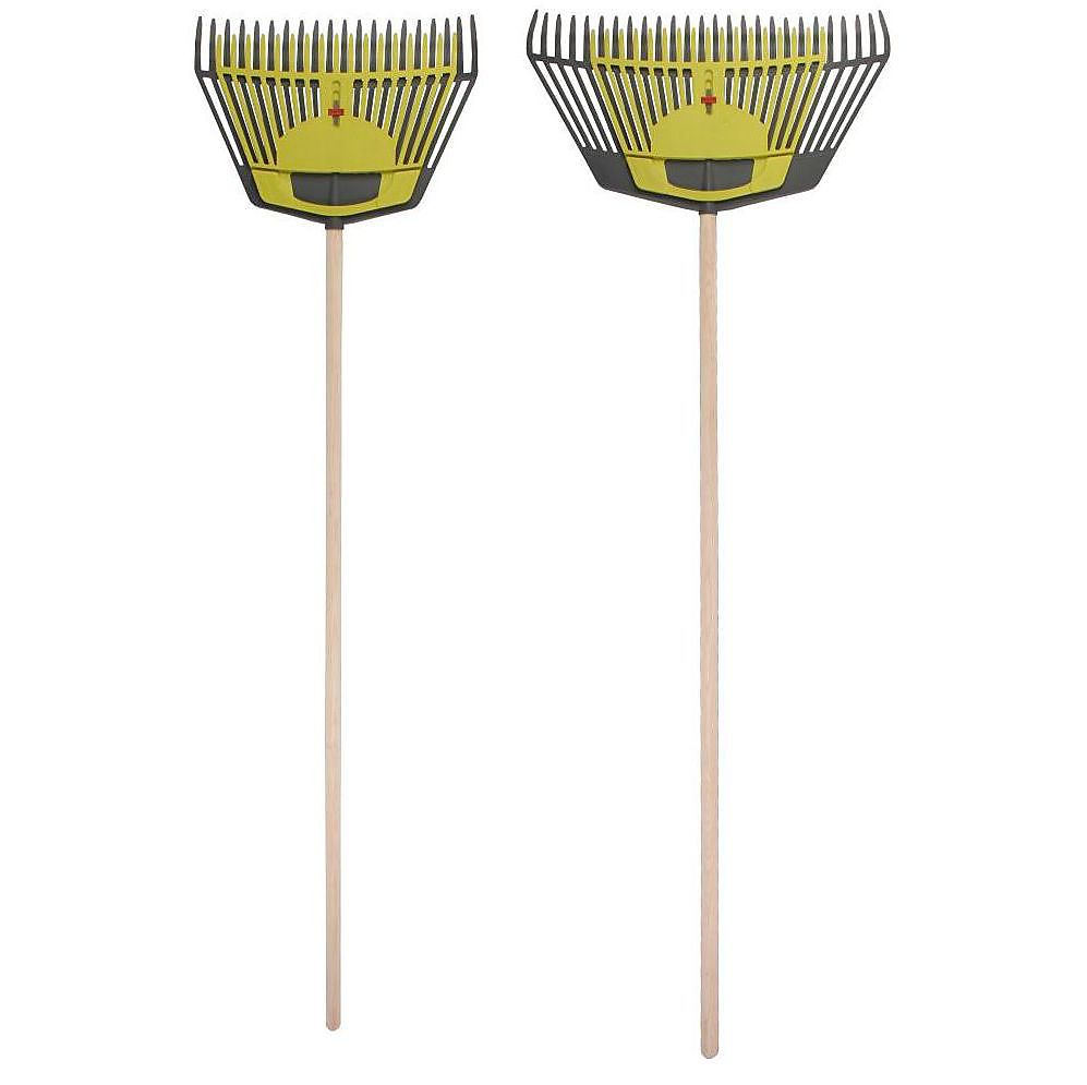 Bladvork/hark 2-in-1 Deze nieuwe bladvork/hark 2-in-1 bestaat uit een stevige bladhark met houten steel en een vastgeklikte handbladvork. Het gereedschap is handig in de tuin om eerst de bladeren samen te harken en ze vervolgens met de limegroene handbladvork in een tuinafvalzak te deponeren. Vervaardigd uit polypropyleen. Verkrijgbaar in 2 maten: 45 cm breed en 60 cm breed; telkens met een houten steel van 160 cm.