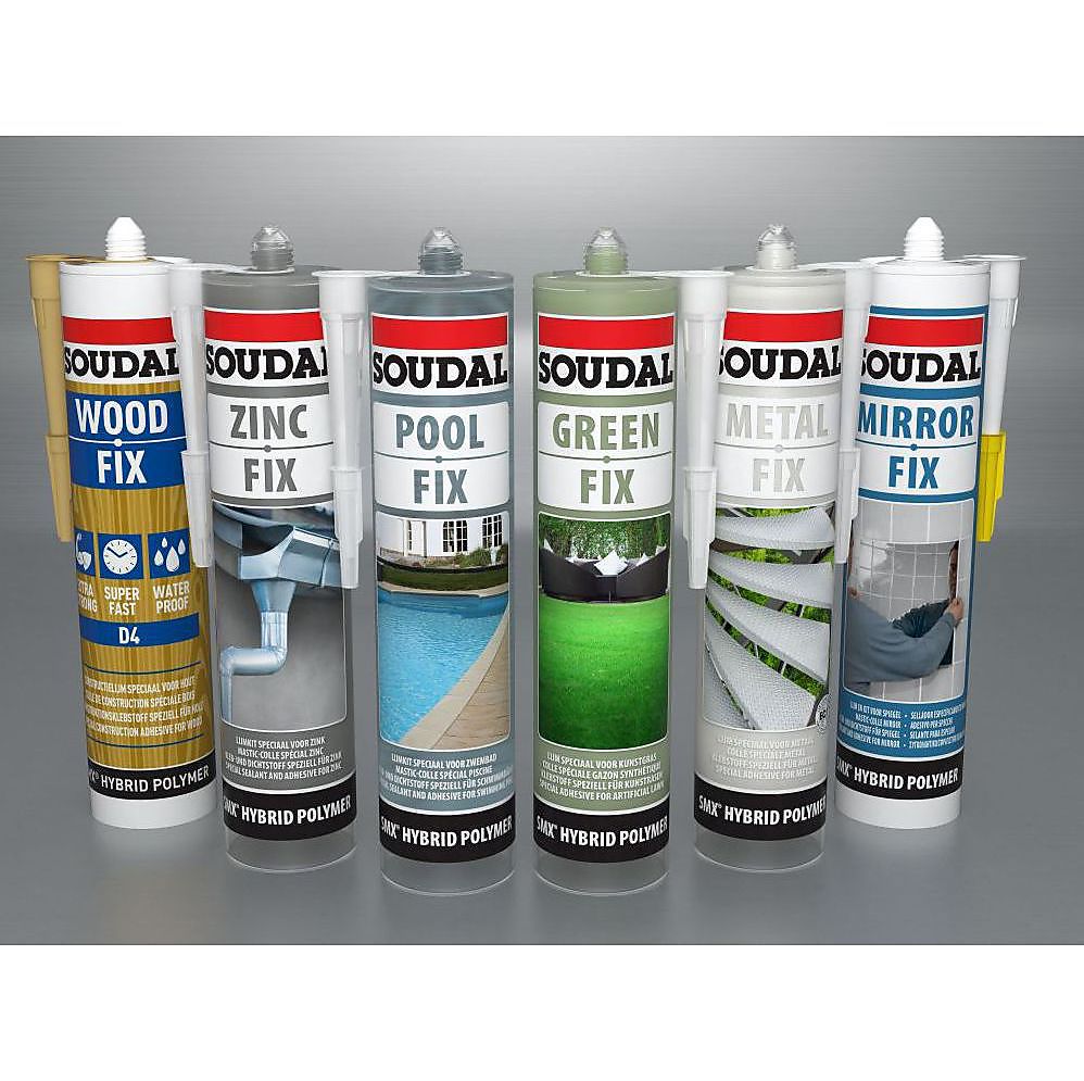 Fix gamma Soudal heeft een nieuw gamma van speciale hybrides ontwikkeld om zeer specifieke toepassingen uit te kunnen voeren met 6 nicheproducten; Green Fix, Pool Fix, Metal Fix, Zinc Fix, Mirror Fix en Wood Fix. Green Fix is voor het verlijmen van kunstgras, Pool Fix is een universele lijmkit voor het repareren van mozaïek en tegels rond zwembaden, Metal Fix is een constructielijm voor zware metalen materialen zonder mechanische bevestiging, Zinc Fix is een lijmkit voor de verlijming van zink op zink en andere bouwmaterialen, Mirror Fix is een elastische lijmkit voor het kleven en afkitten van spiegels, Wood Fix is een constructielijm op basis van D4 polymeren voor hout en houtkleurige materialen.