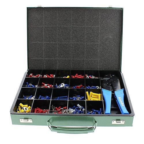 Assortiment kabelschoenen Assortiment kabelschoenen in overzichtelijke kistKlemko Techniek brengt de metalen 21-vaks kist (910005), gevuld met een assortiment geïsoleerde kabelschoenen. Deze stevige kist heeft een uitneembaar binnenwerk van hard kunststof en een dubbele sluiting tegen onverwacht openspringen. De installateur kan in één oogopslag zien welke kabelschoen hij nodig heeft. Onder het uitneembare binnenwerk ligt de index. De installateur kan aan de hand van deze index makkelijk de vulling van een vak nabestellen. De assortimentskist bevat ook de sperkrimptang SKT-0560-GKS (903050) met ergonomische handgrepen. De installateur levert met dit gereedschap een uitstekende persverbinding. De tang komt tijdens het aansluitwerk pas los als de persing volledig is.
