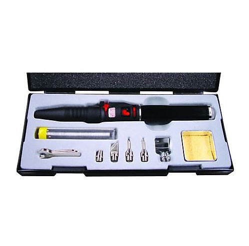 Soldeerset Compro De Compro, die Klemko op de markt brengt, is een set met een gasföhn/soldeerbout en toebehoren voor het verwerken van elektrisch aansluitmateriaal. De soldeertoorts werkt op gas en heeft een piëzo-ontsteking (intern ontstekingmechanisme). Installateur kan beschikken over drie verschillende standaard soldeertips en een 3,5 mm warmtetip. De diameter van de soldeerpunt is 3 mm. De set heeft ook een spiegelreflector en een sponshouder met spons. De opwarmtijd is 10 sec. De temperatuur capaciteit is voor solderen en het krimpen van krimpkous > 500°C en de open vlam bereikt een maximum temperatuur van 1300°C. De soldeertoorts heeft een warmteregeling en een vlamdover. De bedrijfsduur van de gasvulling bedraagt 480 min. Klemko Techniek BV, Nieuwegracht 26, 3763 LB, Soest. Tel. 088 002 33 00. info@klemko.nl. www.klemko.nl
