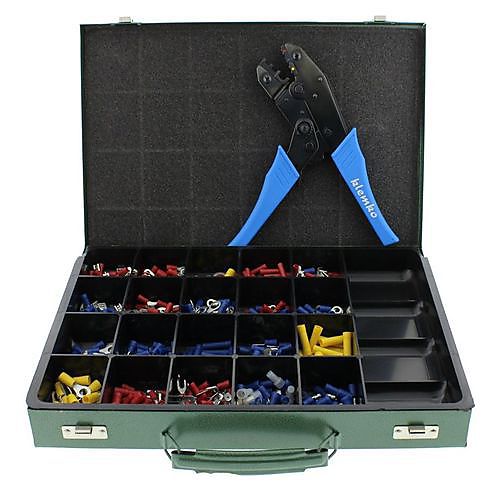Assortiment kabelschoenen Assortiment kabelschoenen in overzichtelijke kist Klemko Techniek brengt de metalen 21-vaks kist (910005), gevuld met een assortiment geïsoleerde kabelschoenen. Deze stevige kist heeft een uitneembaar binnenwerk van hard kunststof en een dubbele sluiting tegen onverwacht openspringen. De installateur kan in één oogopslag zien welke kabelschoen hij nodig heeft. De inhoud bestaat uit de meest gangbare geïsoleerde kabelschoenen. Onder het uitneembare binnenwerk ligt de index. Daarop staat vermeld welk artikelnummer in welk vak ligt. De installateur kan aan de hand van deze index makkelijk de vulling van een vak nabestellen. De assortimentskist bevat ook de sperkrimptang SKT-0560-GKS (903050). De installateur levert met dit gereedschap een uitstekende persverbinding. De tang komt tijdens het aansluitwerk pas los als de persing volledig is.
