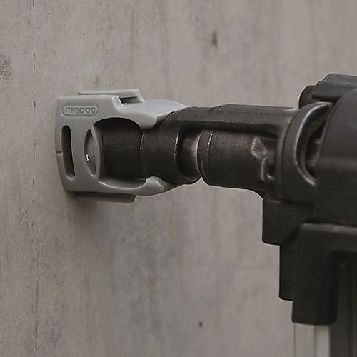 Snel en stofvrij hameren De nieuwe KBS klembeugel van Mepac is ontwikkeld om snel en stofvrij te werken. Door de vernieuwde vormgeving kan hij op de neus van de meest gangbare merken schiethamers worden bevestigd en direct in onder andere hout, beton of metal vast geschoten worden. Tevens kan je met de KBS buizen van 16 en 19 mm vastzetten.