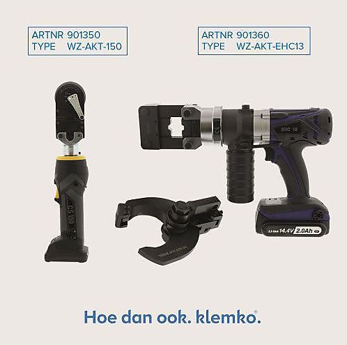 Ergonomische accu-krimptang Ergonomisch elektrisch handgereedschap maakt comfortabeler, sneller en gezonder werken mogelijk. De hydraulische krimptang 150 heeft een compacte éénhandsbediening, geschikt om met universele matrijzen ongeïsoleerde kabelschoenen tot 120 mm² en adereindhulzen tot 16 mm² in een diafragma uitvoering te krimpen. De krimptang EHC13 is geschikt voor zowel krimpen als knippen. De 360°-draaibare gereedschapskop laat zich makkelijk omwisselen. Met de snijkop kunt u draadsnijden tot 54 mm diameters, en de krimpkop kunt u toepassen voor het krimpen van ongeïsoleerde kabelschoenen. Wilt u meer informatie over deze producten of bent u benieuwd naar het volledige assortiment van Klemko? kijk dan op Klemko.nl .