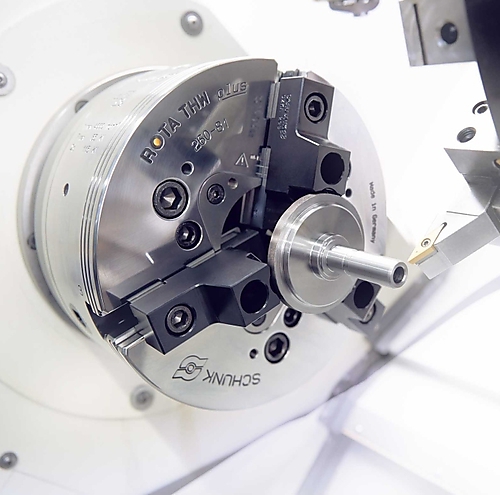 Klauwplaat Klauwplaat voor de efficiëntie productie van kleine en middelgrote aantallen. De grote klauwplaatboring met een doorsnede van 128 mm maakt een buitengewoon veelzijdig gebruik mogelijk. De klauwslag bedraagt 8 mm,de spankracht 240 kN. Het maximale toerental is 3.500 min-1. Omdat de constructie van de ROTA THW plus 400 bijzonder laag is, blijft er veel ruimte in de machine over. Om bij het wisselen van klauwen zeker te zijn van een zo hoog mogelijke bedieningsveiligheid,zorgt een geïntegreerd kogelmechanisme ervoor dat de bedieningssleutel pas kan worden losgetrokken als de spiestang in de basisklem is geklemd. Een slim smeersysteem zorgt er bovendien voor dat de belangrijkste geleidingsvlakken altijd optimaal zijn gesmeerd. Meer informatie vindt u op onze website