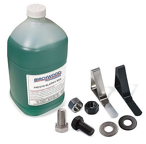 De Presto Black SSB Chemisch zwarten van roestvast staal Nieuw in het programma van Sir John is de Presto Black SSB voor het chemisch zwarten van roestvast staal bij kamertemperatuur. De Presto Black SSB kan gebruikt worden als dompelvloeistof of kan worden aangebracht met een kwast op de te behandelen oppervlakte. De Presto Black SSB reageert snel en geeft een zwarte finish in 1 – 3 minuten. Het gehele proces van reinigen, spoelen, finishing en sealen duurt 12 – 15 minuten bij dompelen, bij werken met de kwast gaat het sneller. De laagdikte is 1 micron en heeft een levensduur van 1200 uur. Er ontstaat een uitstekende corrosie werende laag.