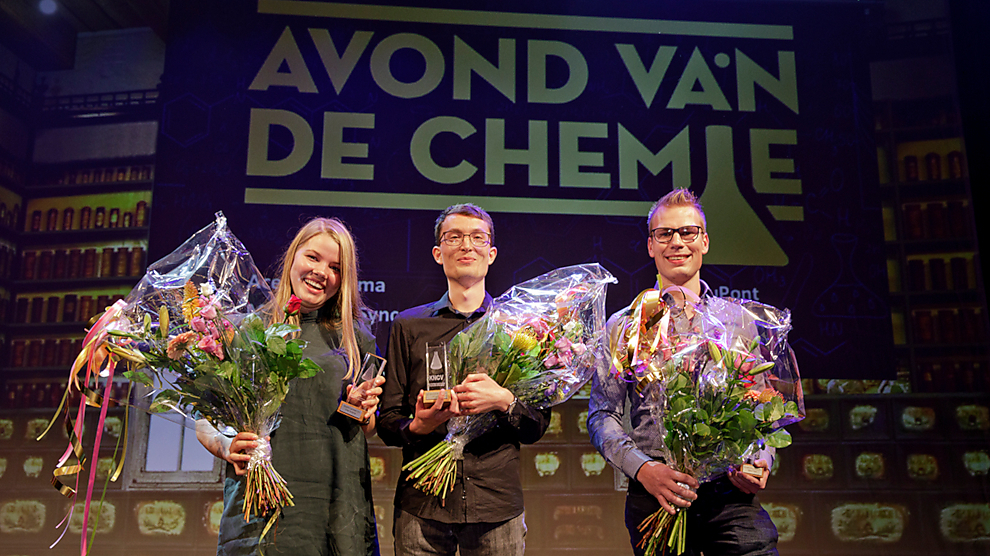 Chemie in de spotlights Drie studentenprijzen zijn uitgereikt tijdens het KNCV Prijzengala Begin oktober vond de vierde editie van de Avond van de Chemie plaats in theater Odeon in Zwolle. Met die avond brengt de Koninklijke Nederlandse Chemische Vereniging (KNCV) chemie naar het theater, waar zowel nieuwe ontwikkelingen als verrassende weetjes aan bod komen. Sprekers Sprekers van de avond waren Marleen Kamperman (Rijksuniversiteit Groningen), Tom van Aken (CEO bij Avantium) en Ewine van Dischoeck (Universiteit Leiden). Marleen Kamperman haalt inspiratie voor innovatieve materialen uit de natuur, zoals insecten of onderwaterdieren. Zij werkt aan onderwaterlijm, zoals de fluweelworm die een speciale stof spuit naar zijn prooi om ze vast te zetten. Tom van Aken is met zijn bedrijf Avantium hard bezig rond duurzamere chemie. Veel plastic verpakkingen laten zich bijvoorbeeld groener produceren. Duurzamer, functioneler en beter afbreekbaar plastic produceren. Hij beschouwt ...
