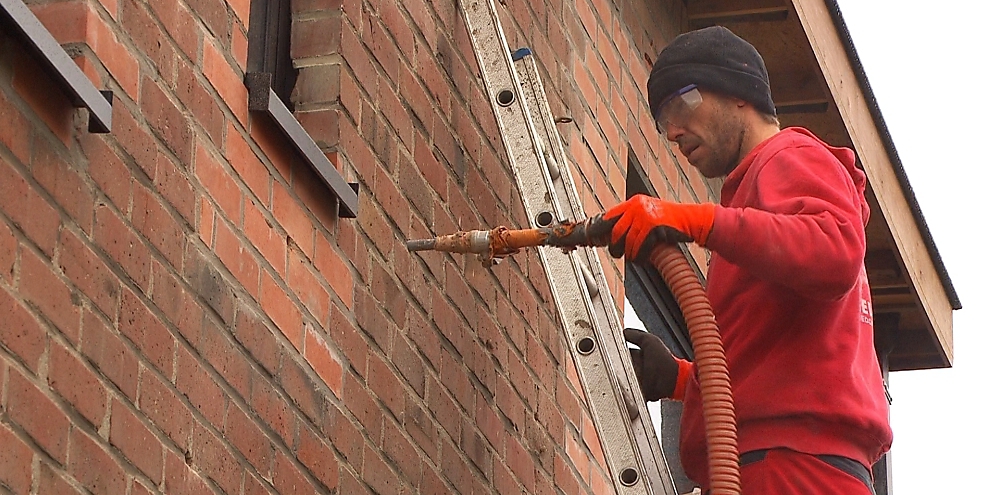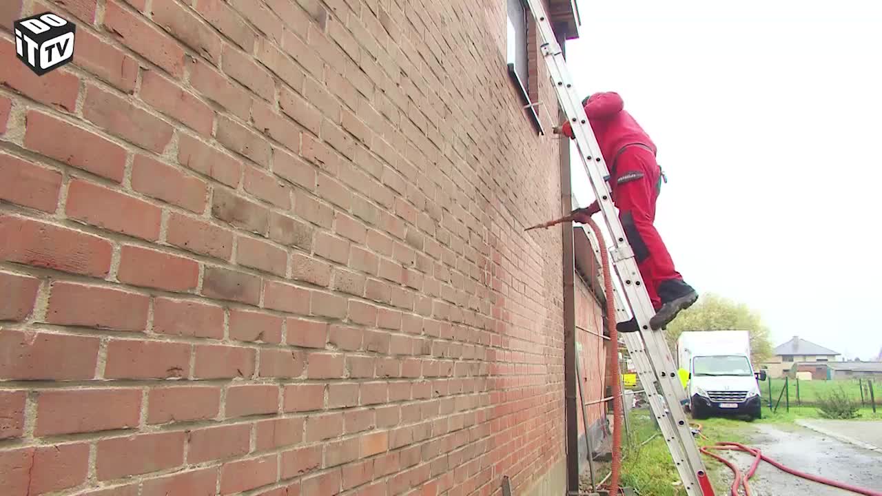 Het zelfbouwhuis - aflevering 43 Na-isoleren van de oude spouwmuren - Ep. 43 - Nu onze woning volledig dicht is door de installatie van de ramen, kunnen we de buitenschil gaan isoleren. We beginnen met de oude spouwmuren. Die gaan we na-isoleren door ze op te spuiten met glaswol. Maar voor we de isolatiewerken beginnen, worden onze nieuwe ramen nog bedekt met een spuitbare beschermfolie. Trefwoorden: spuitfolie