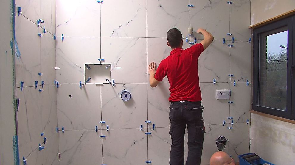 Hoe een luxebadkamer bouwen (deel 5) Roger - ep. 5 - Wand Tegelen. De vloer en de muur in het natte gedeelte worden getegeld. De wanden worden met dezelfde tegels als de vloer betegeld. Dat gebeurd op drie verschillende ondergronden: cementpanelen, gipskarton en gepleisterde muren. Bekijk deel 6 hier.